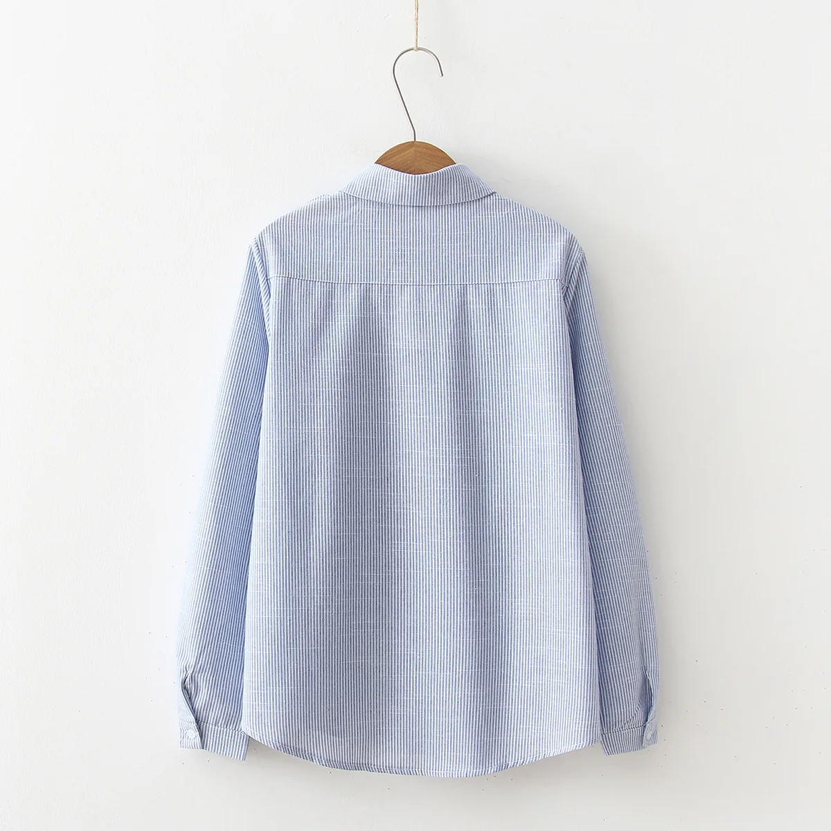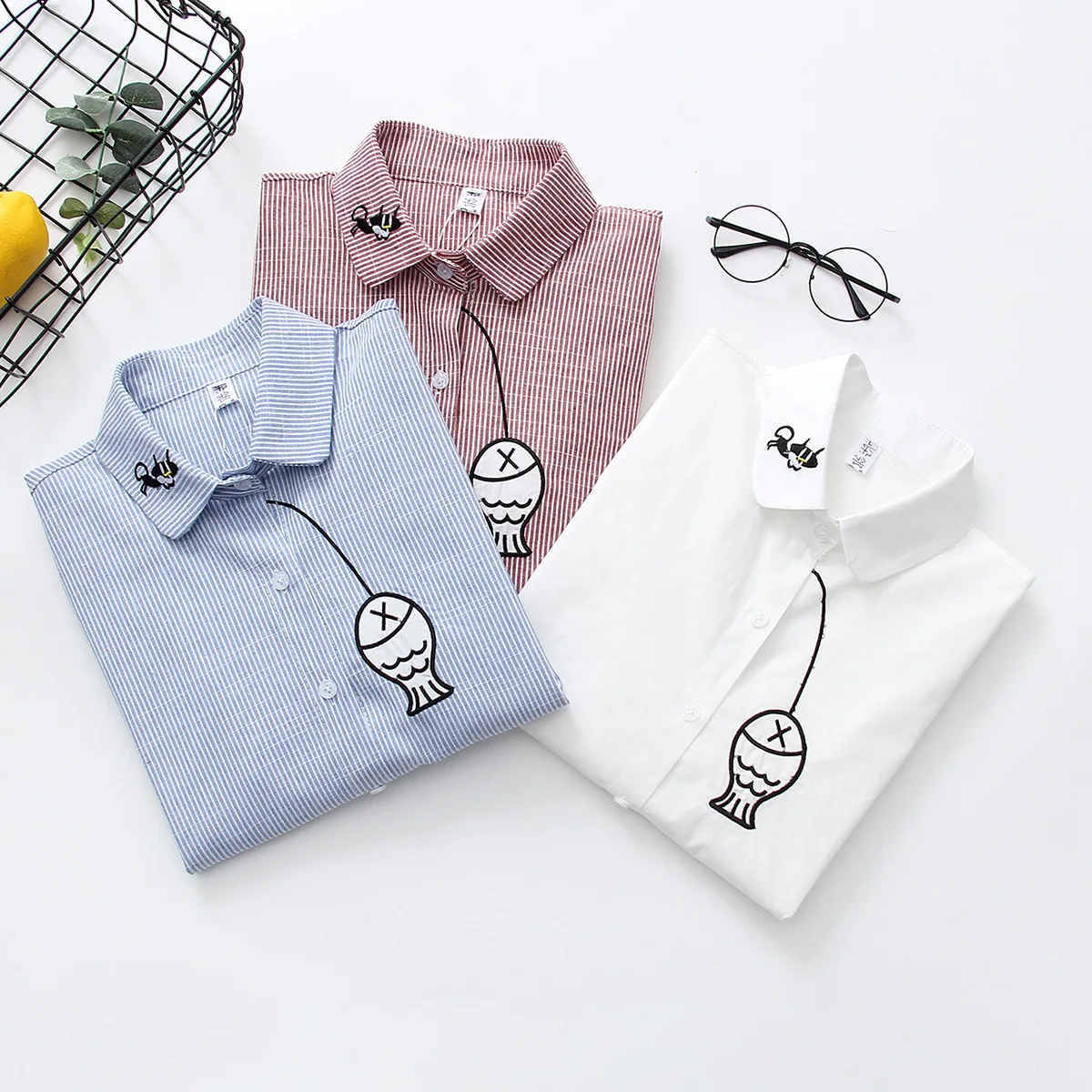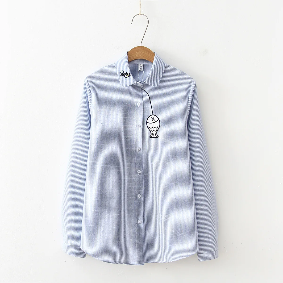 Photo Shoot 2019 Spring New Style Sweet College Style Long Sleeve Striped Shirt Embroidered Kitten
